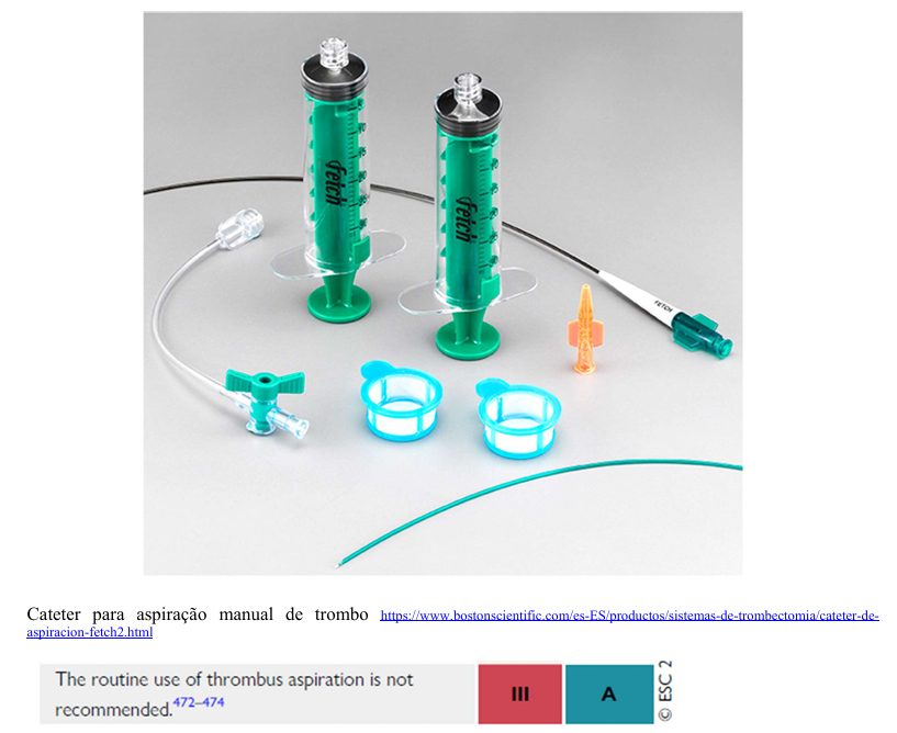 A aspiração rotineira de trombo com cateteres específicos não é recomendada pelas diretrizes devido à falta de benefícios para desfechos duros e ao potencial aumento do risco de acidente vascular cerebral²⁴.